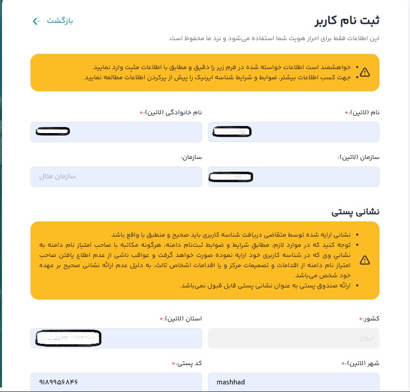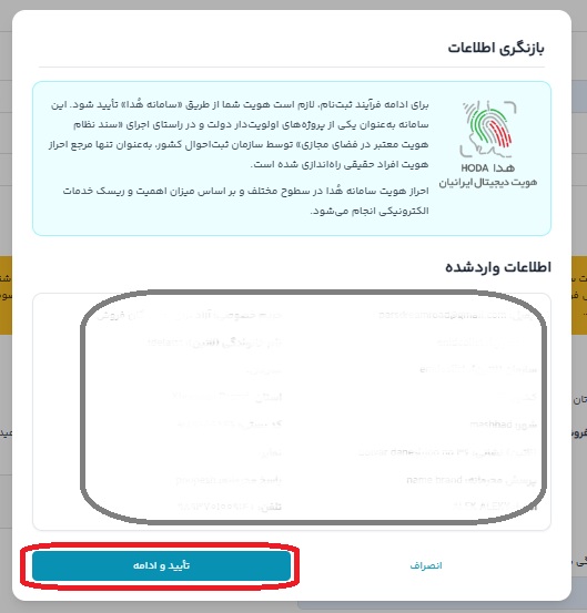 در مرحله بعد اطلاعات وارد شده به شما نمایش داده میشود، اطلاعات را چک و در صورت لزوم تصحیح نمایید و در نهایت در قسمت پایین صفحه نام کامل سازنده ی شناسه، نام و فامیل خود را وارد کنید. از آنجایی که این نام در اطلاعات Who is دامنه شما نمایش داده میشود، در وارد کردن آن دقت نمایید. برای تکمیل ثبت نام، کد امنیتی را وارد کرده و بر روی “موافقم، دریافت شناسه” کلیک کنید.