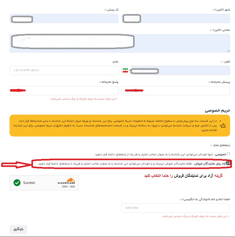 در مرحله بعد فیلدها و مشخصات شناسه را تکمیل کنید و رابط های مجاز را جهت ثبت دامنه توسط پوپش، بر روی گزینه ی “آزاد برای نمایندگان فروش” قرار داده و بر روی کلید بازنگری کلیک کنید.